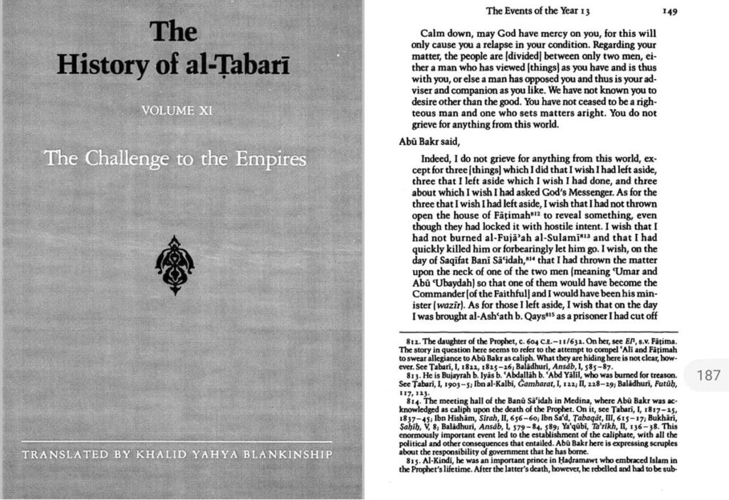 The historical reality is corroborated independently by Sunni authorities. Al-Dhahabī (d. 748 AH), Tārīkh al-Islām, Volume 3, pp. 117–118, and the English translation of al-Ṭabarī (d. 310 AH), The History of al-Ṭabarī, Volume 11, p. 149, record that Abu Bakr expressed three regrets on his deathbed, the first being: