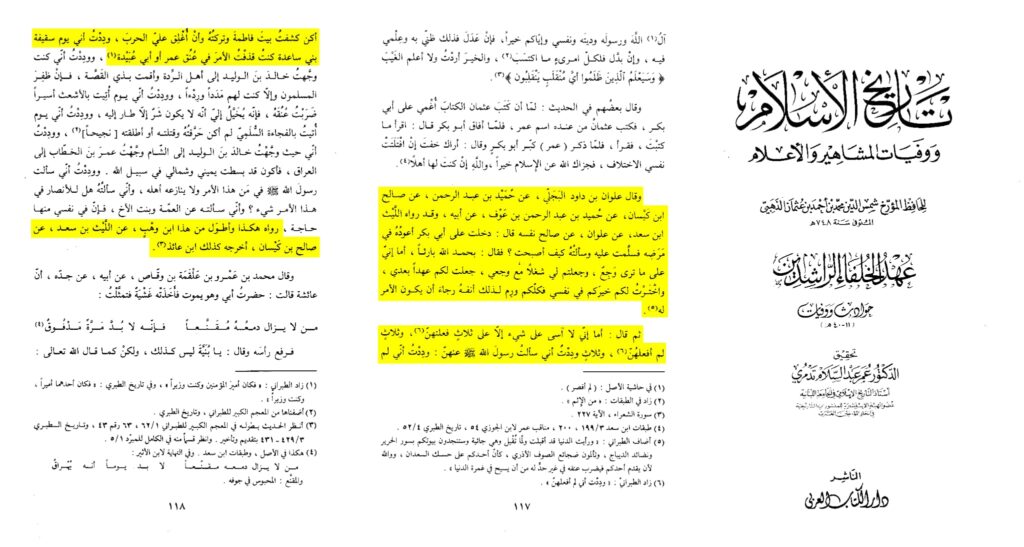 Yet later Sunni editors, seeking to whitewash history, deliberately removed the explicit reference to Fatimah’s house. In the edition edited by Abū Isḥāq al-Ḥuwaynī, the text is sanitised: